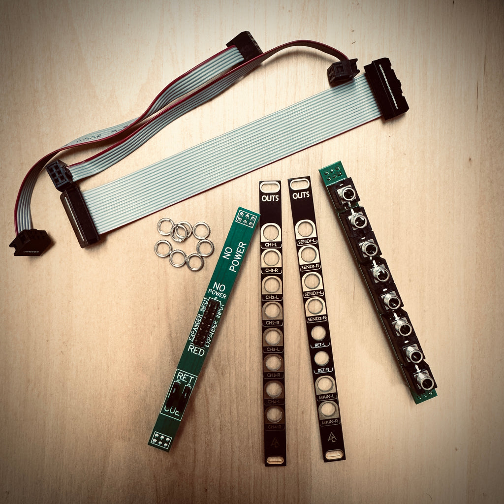 モード1と2の場合、緑色のPCBを2枚とも接続します。ジャンパーはモジュール下半分に取り付け、CUEまたはリターンに設定して、適切なパネル面を取り付けます。その後、2x8ケーブルを使ってBartenderまたはBarbackのExpander出力に接続します。