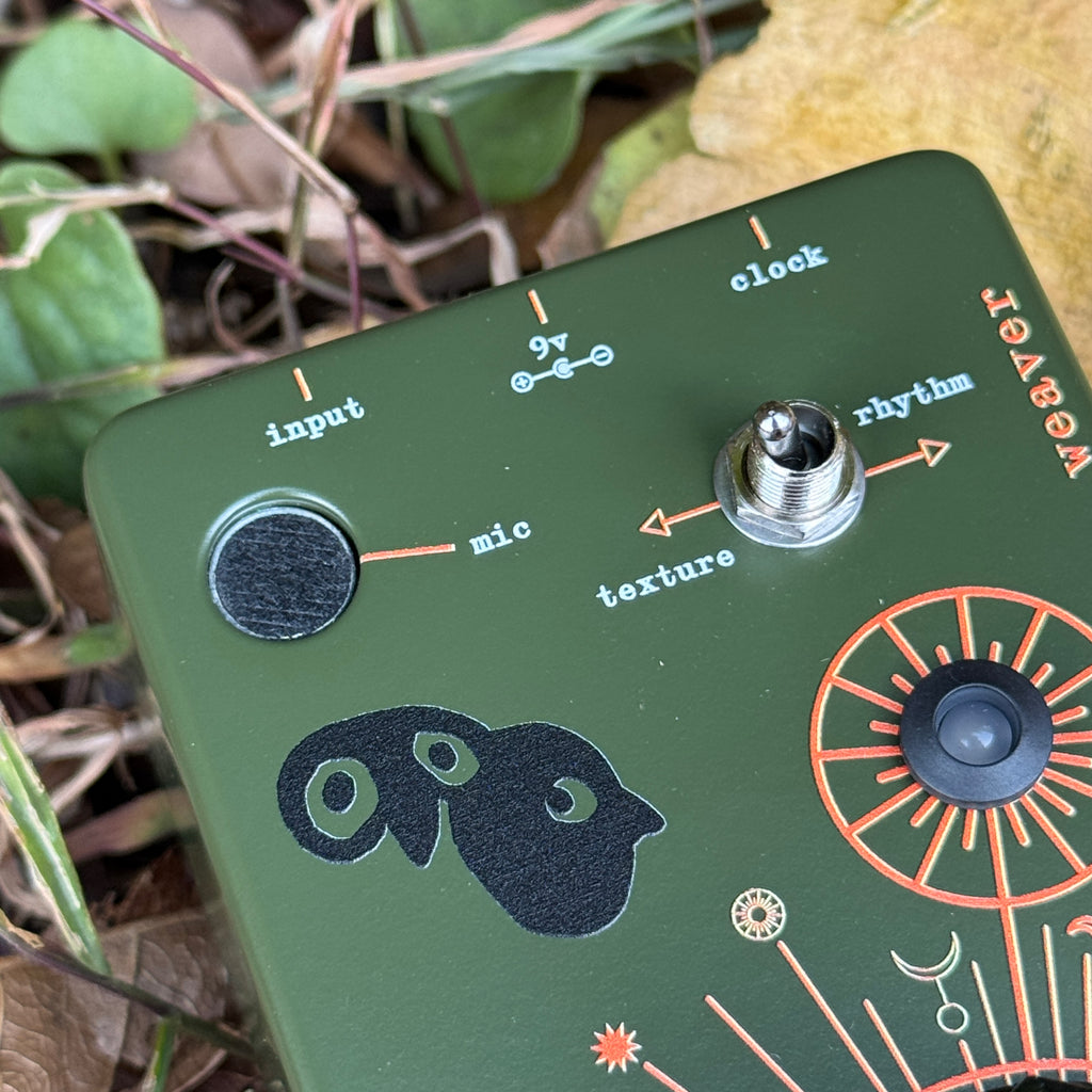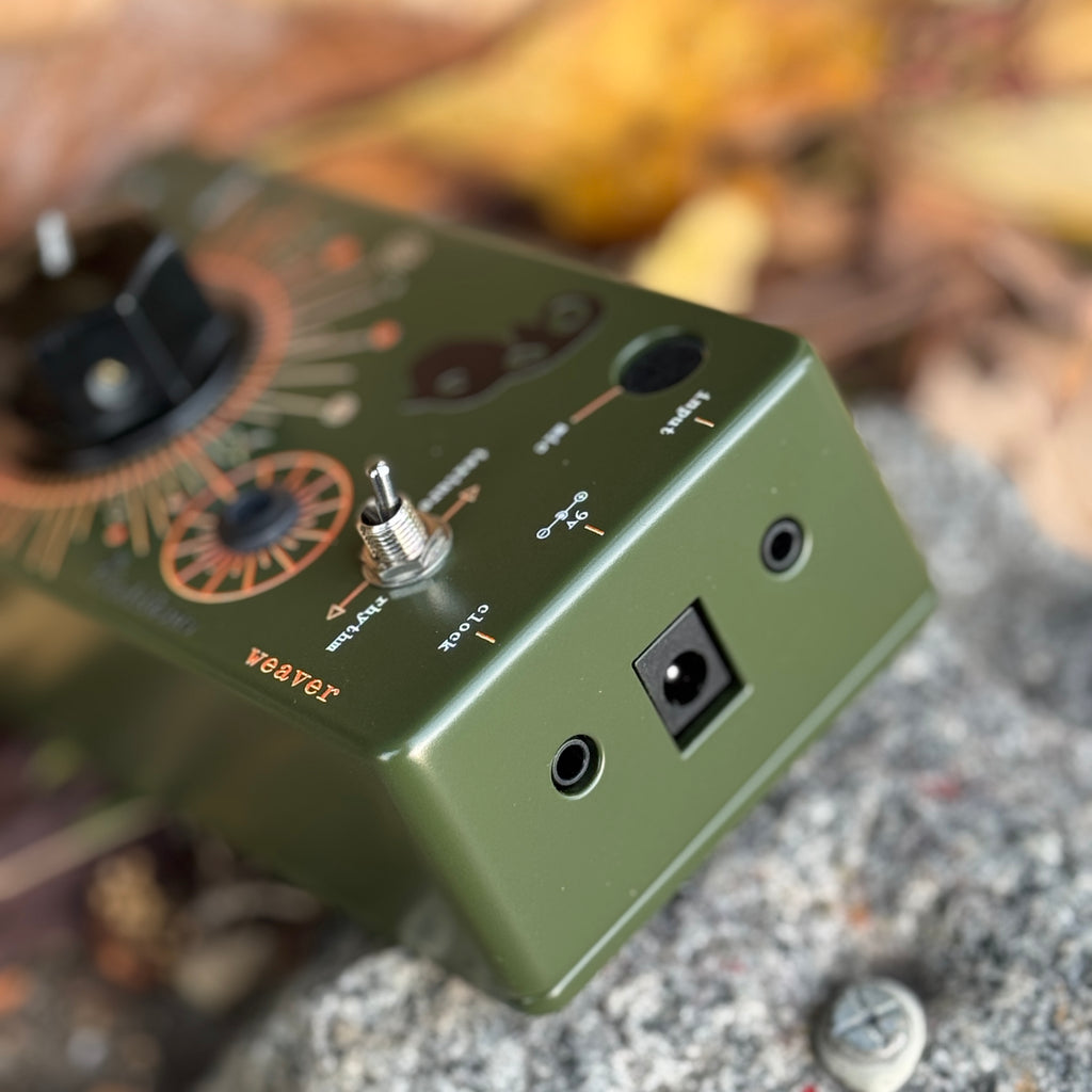 「リズムモード」では、Weaverは外部のコントロール電圧クロック(+5V)でスレーブデバイスとして同期可能です(3.5mmジャック経由、標準モジュラーパッチケーブル対応)。